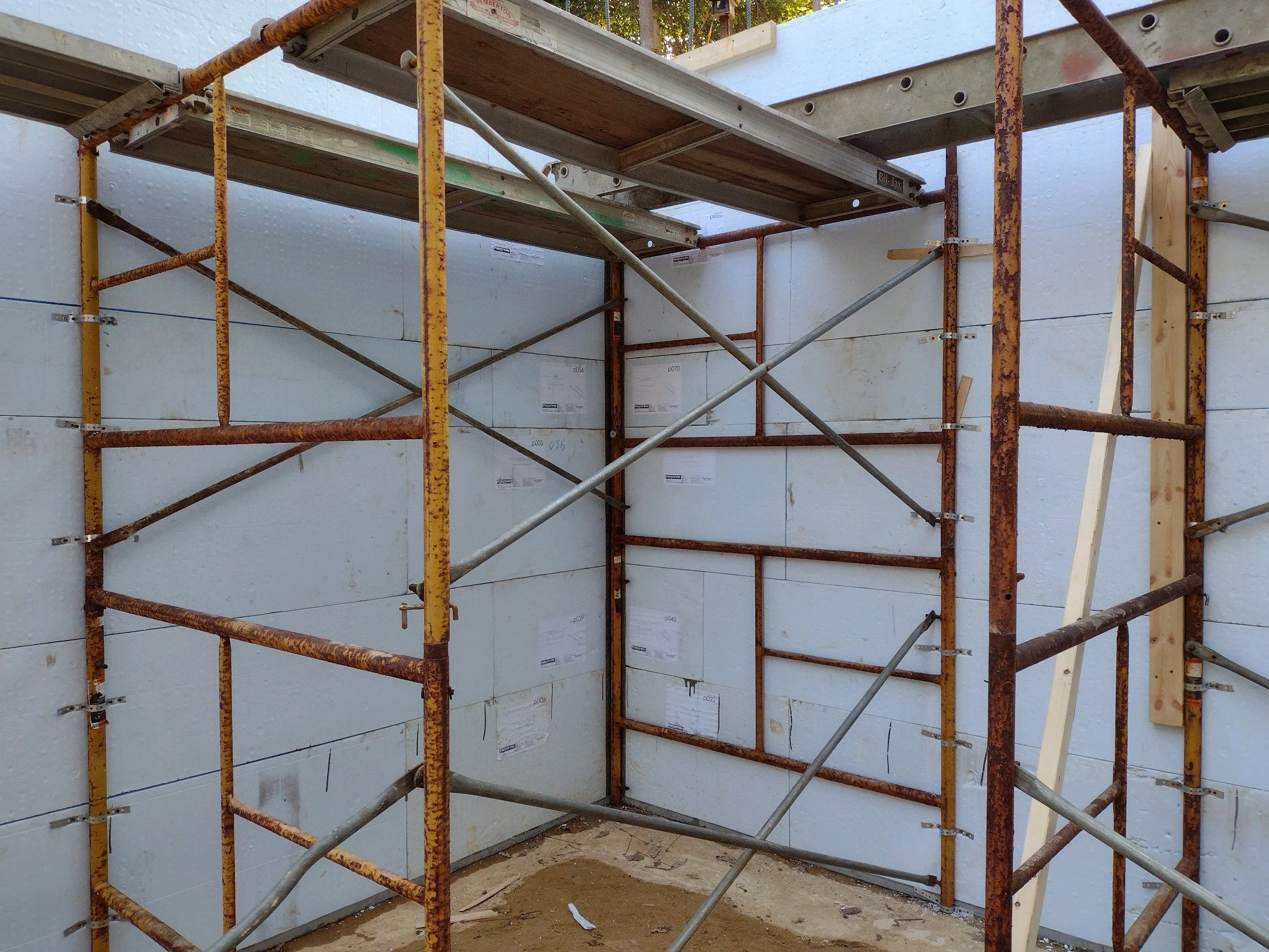 This is a great picture because you can see the labels on the Polycrete pre-cut ICF forms that identify each pre-cut block with a number and a location, and you can see how the pipe scaffolding braces the wall.